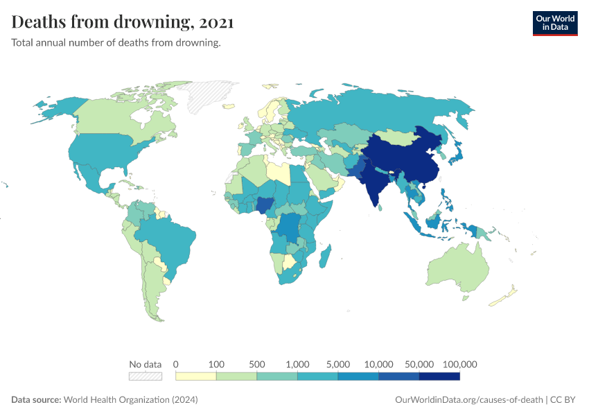 World Health Organization (2024) – with major processing by Our World in Data. “Deaths from drowning” [dataset]. World Health Organization, “Global Health Estimates” [original data]. Retrieved March 2, 2026 from https://data-wdi-depsupdate.owid.pages.dev:8789/20250909-093708/grapher/deaths-from-drowning-ghe.html (archived on September 9, 2025).