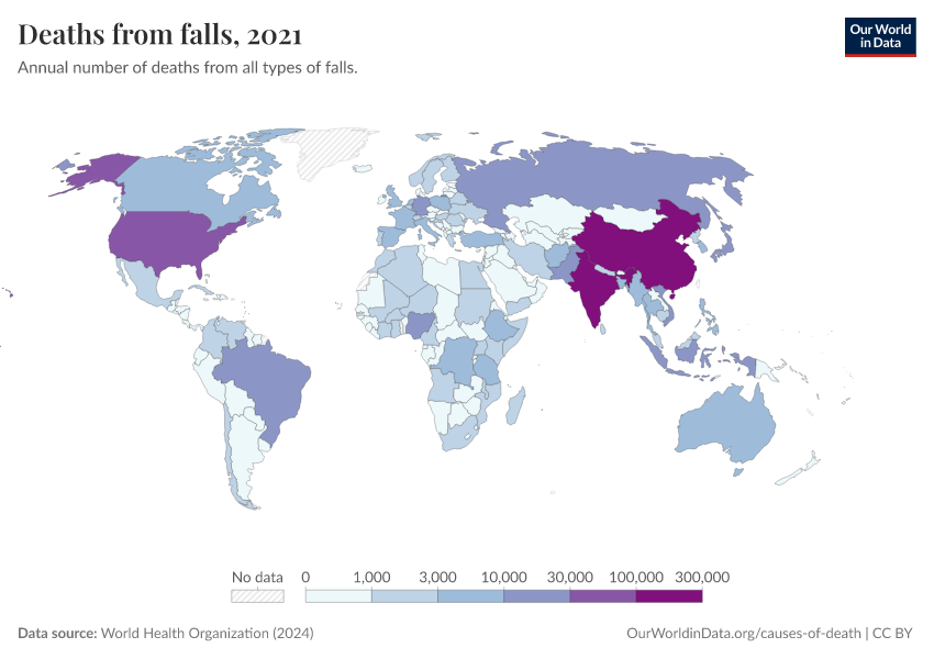 World Health Organization (2024) – with major processing by Our World in Data. “Deaths from falls” [dataset]. World Health Organization, “Global Health Estimates” [original data]. Retrieved March 2, 2026 from https://data-wdi-depsupdate.owid.pages.dev:8789/20250909-093708/grapher/deaths-from-falls.html (archived on September 9, 2025).