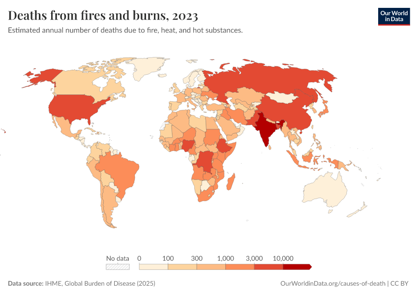 IHME, Global Burden of Disease (2025) – with major processing by Our World in Data. “Deaths from fires and burns” [dataset]. IHME, Global Burden of Disease, “Global Burden of Disease - Deaths” [original data]. Retrieved March 2, 2026 from https://data-wdi-depsupdate.owid.pages.dev:8789/20260211-174736/grapher/deaths-from-fires-and-burns.html (archived on February 11, 2026).