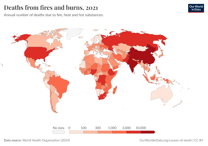 World Health Organization (2024) – with major processing by Our World in Data. “Deaths from fires and burns” [dataset]. World Health Organization, “Global Health Estimates” [original data]. Retrieved March 2, 2026 from https://data-wdi-depsupdate.owid.pages.dev:8789/20250909-093708/grapher/deaths-from-fires-and-burns-who.html (archived on September 9, 2025).