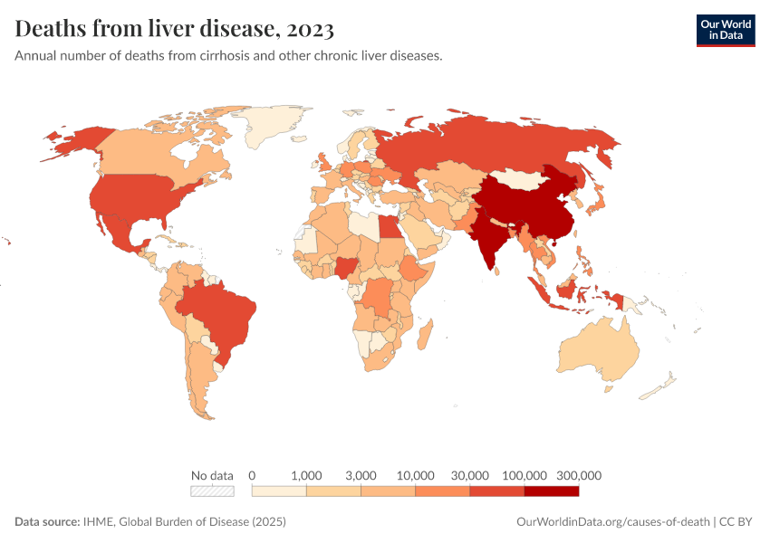 IHME, Global Burden of Disease (2025) – with major processing by Our World in Data. “Deaths from liver disease” [dataset]. IHME, Global Burden of Disease, “Global Burden of Disease - Deaths” [original data]. Retrieved March 2, 2026 from https://data-wdi-depsupdate.owid.pages.dev:8789/20260211-174736/grapher/deaths-from-liver-disease.html (archived on February 11, 2026).