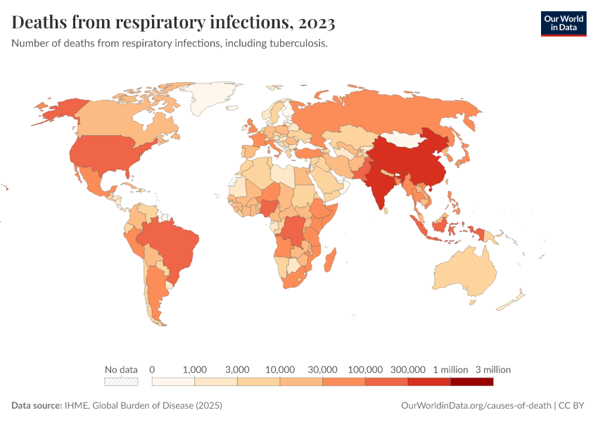 IHME, Global Burden of Disease (2025) – with major processing by Our World in Data. “Deaths from respiratory infections” [dataset]. IHME, Global Burden of Disease, “Global Burden of Disease - Deaths” [original data]. Retrieved March 2, 2026 from https://data-wdi-depsupdate.owid.pages.dev:8789/20260211-174736/grapher/deaths-from-respiratory-infections.html (archived on February 11, 2026).