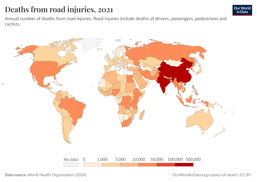 World Health Organization (2024) – with major processing by Our World in Data. “Deaths from road injuries” [dataset]. World Health Organization, “Global Health Estimates” [original data]. Retrieved March 2, 2026 from https://data-wdi-depsupdate.owid.pages.dev:8789/20250909-093708/grapher/deaths-from-road-injuries.html (archived on September 9, 2025).