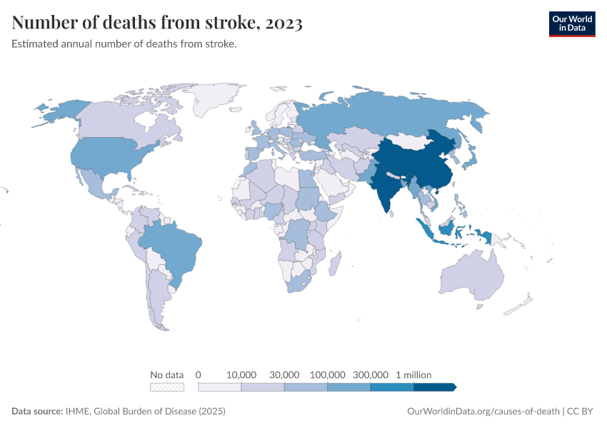 IHME, Global Burden of Disease (2025) – with major processing by Our World in Data. “Number of deaths from stroke” [dataset]. IHME, Global Burden of Disease, “Global Burden of Disease - Deaths” [original data]. Retrieved March 2, 2026 from https://data-wdi-depsupdate.owid.pages.dev:8789/20260211-174736/grapher/deaths-from-strokes.html (archived on February 11, 2026).