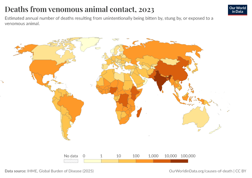 IHME, Global Burden of Disease (2025) – with major processing by Our World in Data. “Deaths from venomous animal contact” [dataset]. IHME, Global Burden of Disease, “Global Burden of Disease - Deaths” [original data]. Retrieved March 2, 2026 from https://data-wdi-depsupdate.owid.pages.dev:8789/20260211-174736/grapher/deaths-from-venomous-animal-contact.html (archived on February 11, 2026).