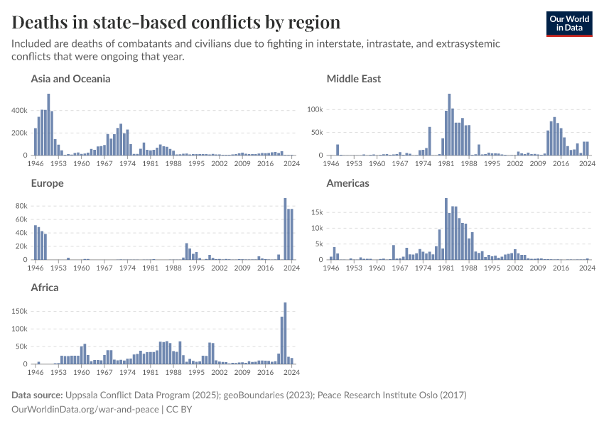 “Data Page: Deaths in state-based conflicts by region”, part of the following publication: Bastian Herre, Lucas Rodés-Guirao, and Max Roser (2024) - “War and Peace”. Data adapted from Uppsala Conflict Data Program, geoBoundaries, Peace Research Institute Oslo. Retrieved from https://data-wdi-depsupdate.owid.pages.dev:8789/20260119-070102/grapher/deaths-in-state-based-conflicts-by-region.html [online resource] (archived on January 19, 2026).How to cite this data