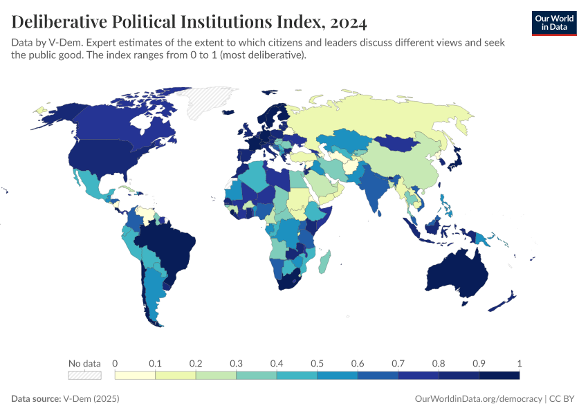 “Data Page: Deliberative political institutions index”, part of the following publication: Bastian Herre, Lucas Rodés-Guirao, and Esteban Ortiz-Ospina (2013) - “Democracy”. Data adapted from V-Dem. Retrieved from https://data-wdi-depsupdate.owid.pages.dev:8789/20260119-070102/grapher/deliberative-political-institutions-index.html [online resource] (archived on January 19, 2026).How to cite this data