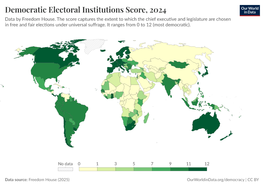 Freedom House (2025) – processed by Our World in Data. “Democratic Electoral Institutions Score” [dataset]. Freedom House, “Freedom in the World” [original data]. Retrieved March 2, 2026 from https://data-wdi-depsupdate.owid.pages.dev:8789/20260204-170225/grapher/democratic-electoral-institutions-fh.html (archived on February 4, 2026).