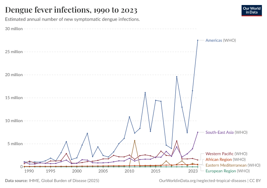 IHME, Global Burden of Disease (2025) – with major processing by Our World in Data. “Dengue fever infections” [dataset]. IHME, Global Burden of Disease, “Global Burden of Disease - Prevalence and Incidence” [original data]. Retrieved March 2, 2026 from https://data-wdi-depsupdate.owid.pages.dev:8789/20260212-172859/grapher/dengue-incidence.html (archived on February 12, 2026).