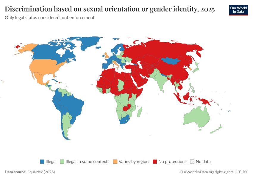 Equaldex (2025) – with major processing by Our World in Data. “Discrimination based on sexual orientation or gender identity” [dataset]. Equaldex, “Equaldex” [original data]. Retrieved March 2, 2026 from https://data-wdi-depsupdate.owid.pages.dev:8789/20250909-093708/grapher/discrimination-lgbt-equaldex.html (archived on September 9, 2025).