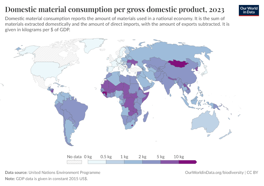 United Nations Environment Programme – processed by Our World in Data. “Domestic material consumption per gross domestic product” [dataset]. United Nations Environment Programme, “WESR / Global Material Flows Database” [original data]. Retrieved March 2, 2026 from https://data-wdi-depsupdate.owid.pages.dev:8789/20260130-180113/grapher/domestic-material-consumption-per-unit-of-gdp.html (archived on January 30, 2026).