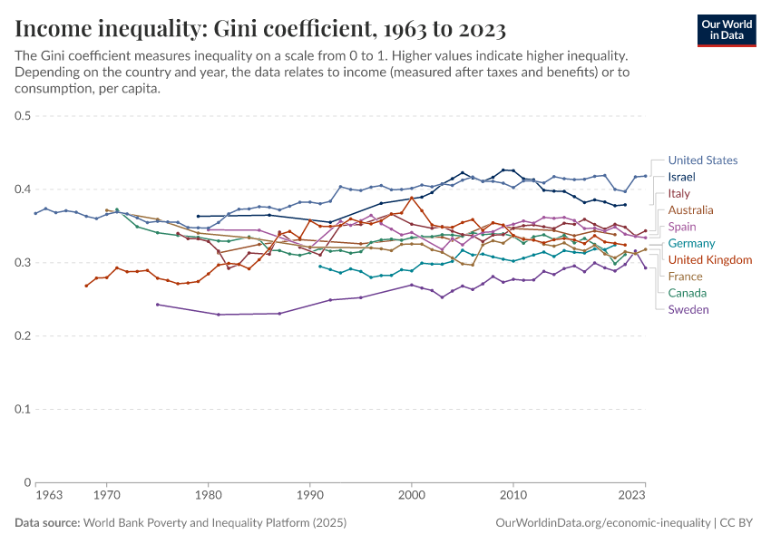 World Bank Poverty and Inequality Platform (2025) – with major processing by Our World in Data. “Income inequality: Gini coefficient – World Bank” [dataset]. World Bank Poverty and Inequality Platform, “World Bank Poverty and Inequality Platform (PIP) 20250930_2021, 20250930_2017” [original data]. Retrieved March 2, 2026 from https://data-wdi-depsupdate.owid.pages.dev:8789/20260127-114142/grapher/economic-inequality-gini-index.html (archived on January 27, 2026).