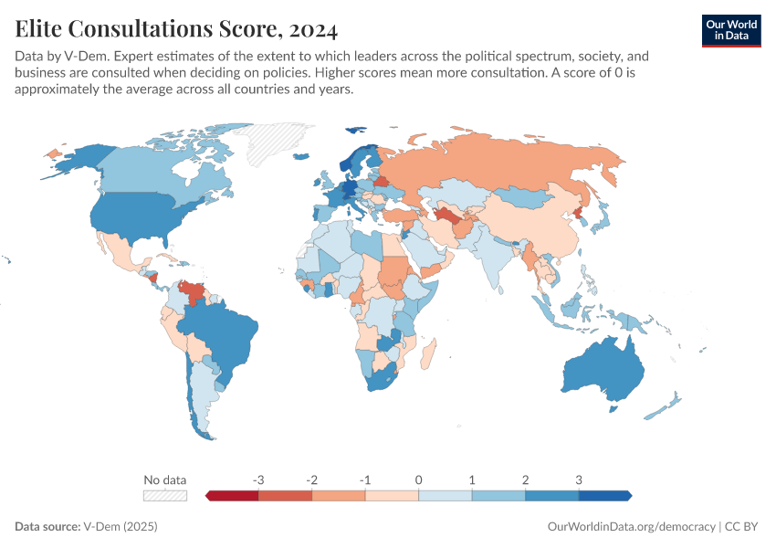“Data Page: Elite consultation”, part of the following publication: Bastian Herre, Lucas Rodés-Guirao, and Esteban Ortiz-Ospina (2013) - “Democracy”. Data adapted from V-Dem. Retrieved from https://data-wdi-depsupdate.owid.pages.dev:8789/20260204-170225/grapher/elite-consultations-score.html [online resource] (archived on February 4, 2026).How to cite this data