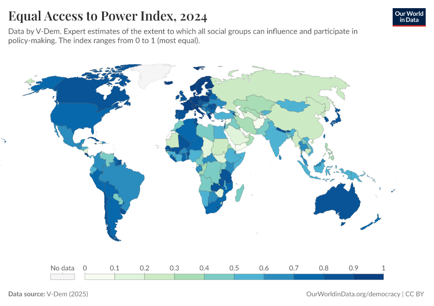 “Data Page: Equal access to power index”, part of the following publication: Bastian Herre, Lucas Rodés-Guirao, and Esteban Ortiz-Ospina (2013) - “Democracy”. Data adapted from V-Dem. Retrieved from https://data-wdi-depsupdate.owid.pages.dev:8789/20260119-070102/grapher/equal-access-to-power-index.html [online resource] (archived on January 19, 2026).How to cite this data