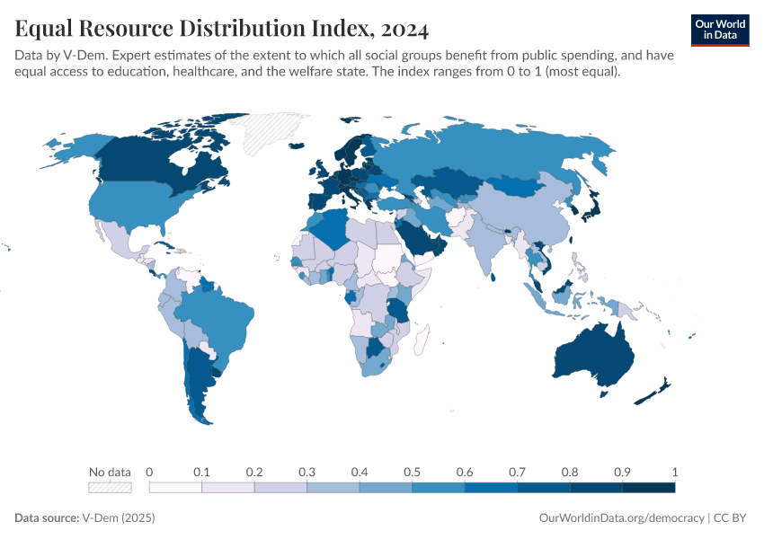 “Data Page: Equal resource distribution index”, part of the following publication: Bastian Herre, Lucas Rodés-Guirao, and Esteban Ortiz-Ospina (2013) - “Democracy”. Data adapted from V-Dem. Retrieved from https://data-wdi-depsupdate.owid.pages.dev:8789/20260119-070102/grapher/equal-resource-distribution-index.html [online resource] (archived on January 19, 2026).How to cite this data