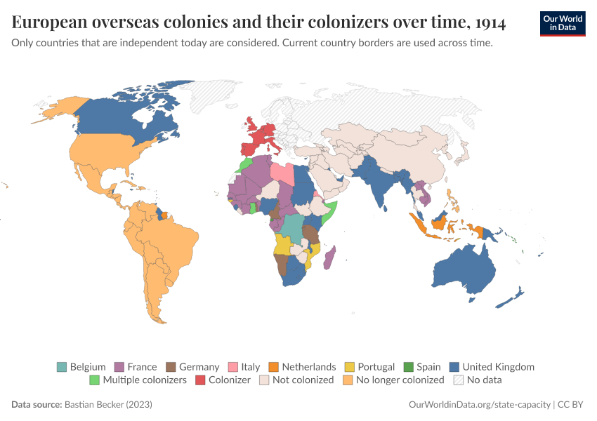 “Data Page: European overseas colonies and their colonizers over time”, part of the following publication: Bastian Herre and Pablo Arriagada (2023) - “State Capacity”. Data adapted from Bastian Becker. Retrieved from https://data-wdi-depsupdate.owid.pages.dev:8789/20250909-093708/grapher/european-overseas-colonies-and-their-colonizers.html [online resource] (archived on September 9, 2025).How to cite this data