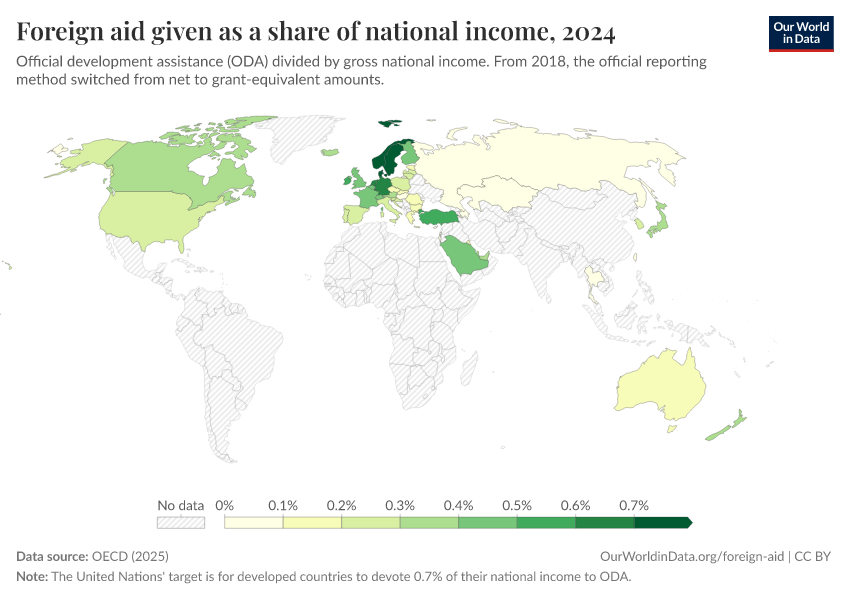 “Data Page: Foreign aid given as a share of national income”, part of the following publication: Bastian Herre, Pablo Arriagada, Simon van Teutem, and Hannah Ritchie (2024) - “Foreign Aid”. Data adapted from OECD. Retrieved from https://data-wdi-depsupdate.owid.pages.dev:8789/20251230-141326/grapher/foreign-aid-given-as-a-share-of-national-income.html [online resource] (archived on December 30, 2025).How to cite this data