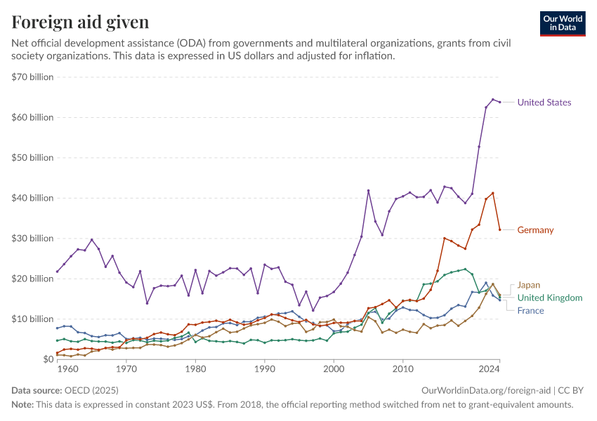 OECD (2025) – with major processing by Our World in Data. “Foreign aid given – Net disbursements” [dataset]. OECD, “OECD Official Development Assistance (ODA) - DAC1: Flows by provider (ODA+OOF+Private)”; OECD, “OECD Official Development Assistance (ODA) - DAC2A: Aid (ODA) disbursements to countries and regions” [original data]. Retrieved March 2, 2026 from https://data-wdi-depsupdate.owid.pages.dev:8789/20260223-070107/grapher/foreign-aid-given-net.html (archived on February 23, 2026).
