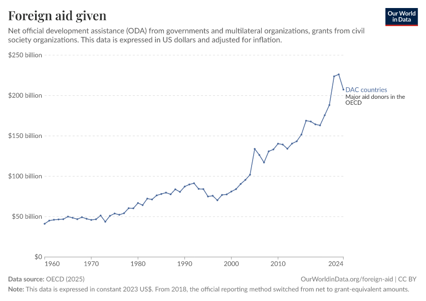 OECD (2025) – with major processing by Our World in Data. “Foreign aid given – Net disbursements” [dataset]. OECD, “OECD Official Development Assistance (ODA) - DAC1: Flows by provider (ODA+OOF+Private)”; OECD, “OECD Official Development Assistance (ODA) - DAC2A: Aid (ODA) disbursements to countries and regions” [original data]. Retrieved March 2, 2026 from https://data-wdi-depsupdate.owid.pages.dev:8789/20260223-070107/grapher/foreign-aid-given-net.html (archived on February 23, 2026).