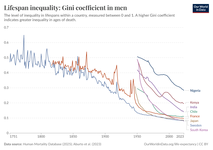 “Data Page: Lifespan inequality: Gini coefficient in men”, part of the following publication: Saloni Dattani, Lucas Rodés-Guirao, Hannah Ritchie, Esteban Ortiz-Ospina, and Max Roser (2023) - “Life Expectancy”. Data adapted from Human Mortality Database, United Nations. Retrieved from https://data-wdi-depsupdate.owid.pages.dev:8789/20251022-222946/grapher/gini-coefficient-of-lifespan-inequality-in-males.html [online resource] (archived on October 22, 2025).How to cite this data