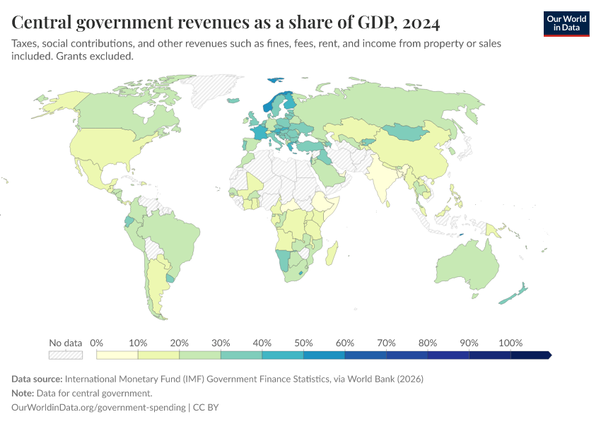 “Data Page: Central government revenues as a share of GDP”. Our World in Data (2026). Data adapted from International Monetary Fund (IMF) Government Finance Statistics, via World Bank. Retrieved from https://data-wdi-depsupdate.owid.pages.dev:8789/20260301-083443/grapher/government-revenues-as-a-share-of-gdp-world-bank.html [online resource] (archived on March 1, 2026).How to cite this data
