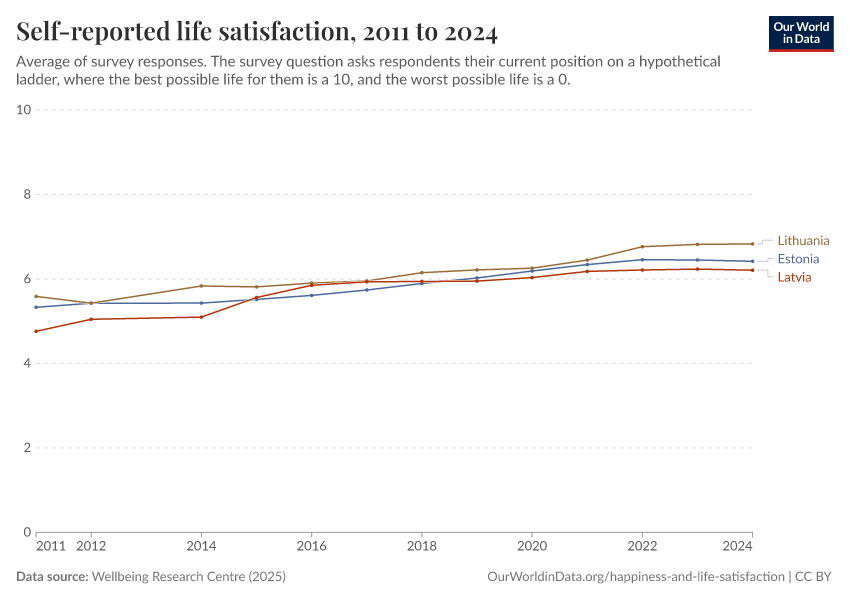 Wellbeing Research Centre (2025) – with major processing by Our World in Data. “Self-reported life satisfaction” [dataset]. Wellbeing Research Centre, “World Happiness Report 2025” [original data]. Retrieved March 2, 2026 from https://data-wdi-depsupdate.owid.pages.dev:8789/20260119-065148/grapher/happiness-cantril-ladder.html (archived on January 19, 2026).
