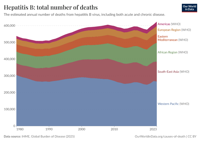 IHME, Global Burden of Disease (2025) – with major processing by Our World in Data. “Hepatitis B: total number of deaths” [dataset]. IHME, Global Burden of Disease, “Global Burden of Disease - Deaths” [original data]. Retrieved March 2, 2026 from https://data-wdi-depsupdate.owid.pages.dev:8789/20260211-174736/grapher/hepatitis-b-number-of-deaths.html (archived on February 11, 2026).