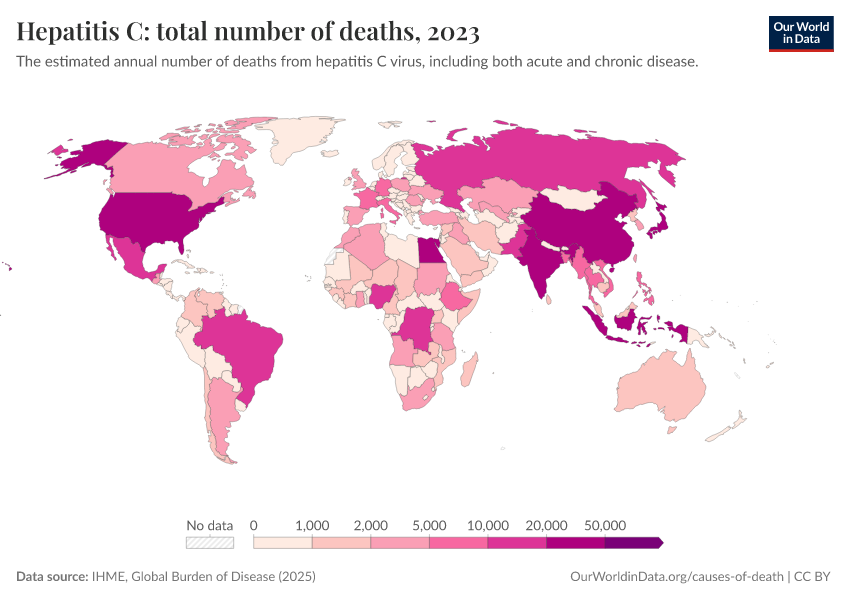 IHME, Global Burden of Disease (2025) – with major processing by Our World in Data. “Hepatitis C: total number of deaths” [dataset]. IHME, Global Burden of Disease, “Global Burden of Disease - Deaths” [original data]. Retrieved March 2, 2026 from https://data-wdi-depsupdate.owid.pages.dev:8789/20260211-174736/grapher/hepatitis-c-number-of-deaths.html (archived on February 11, 2026).