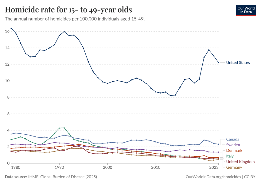 IHME, Global Burden of Disease (2025) – with major processing by Our World in Data. “Homicide rate for 15- to 49-year olds” [dataset]. IHME, Global Burden of Disease, “Global Burden of Disease - Deaths” [original data]. Retrieved March 2, 2026 from https://data-wdi-depsupdate.owid.pages.dev:8789/20260211-174736/grapher/homicide-rate-in-15--to-49-year-olds.html (archived on February 11, 2026).