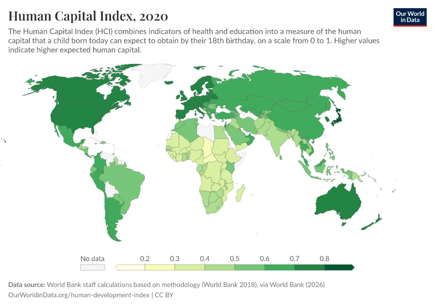 “Data Page: Human Capital Index”. Our World in Data (2026). Data adapted from World Bank staff calculations based on methodology (World Bank 2018), via World Bank. Retrieved from https://data-wdi-depsupdate.owid.pages.dev:8789/20260202-181317/grapher/human-capital-index-in-2018.html [online resource] (archived on February 2, 2026).How to cite this data