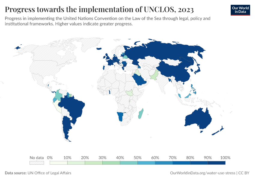 “Data Page: Progress towards the implementation of UNCLOS”. Our World in Data (2026). Data adapted from UN Office of Legal Affairs. Retrieved from https://data-wdi-depsupdate.owid.pages.dev:8789/20251120-211749/grapher/implementation-of-unclos.html [online resource] (archived on November 20, 2025).How to cite this data