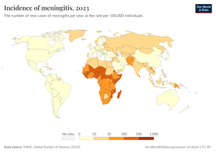 “Data Page: Incidence of meningitis”, part of the following publication: Esteban Ortiz-Ospina and Max Roser (2016) - “Global Health”. Data adapted from IHME, Global Burden of Disease. Retrieved from https://data-wdi-depsupdate.owid.pages.dev:8789/20260212-172859/grapher/incidence-of-meningitis.html [online resource] (archived on February 12, 2026).How to cite this data