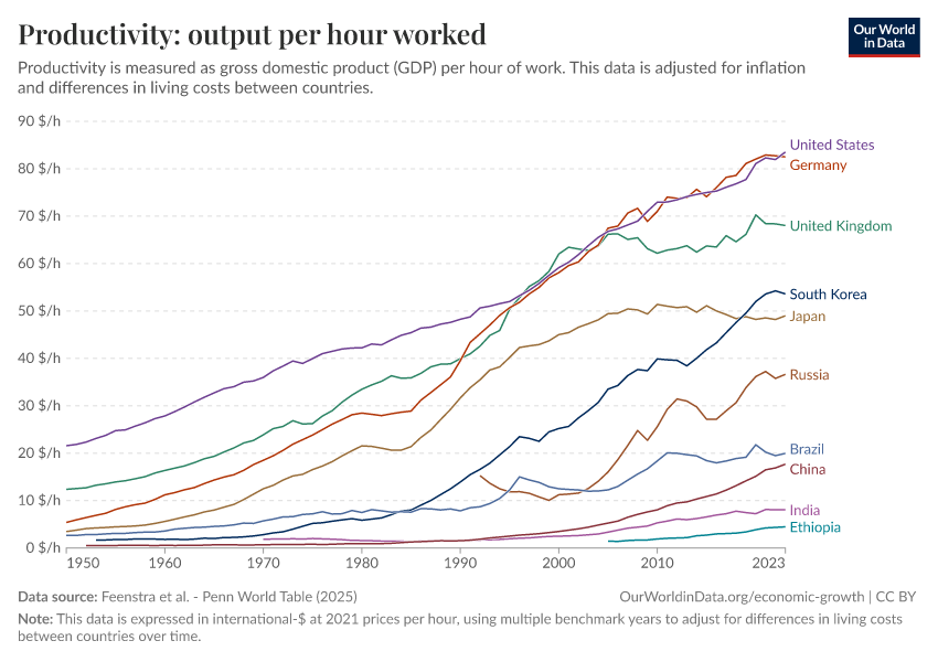 Feenstra et al. - Penn World Table (2025) – with major processing by Our World in Data. “Productivity: output per hour worked – Penn World Table – In constant international-$” [dataset]. Feenstra et al., “Penn World Table 11.0” [original data]. Retrieved March 2, 2026 from https://data-wdi-depsupdate.owid.pages.dev:8789/20251013-111729/grapher/labor-productivity-per-hour-pennworldtable.html (archived on October 13, 2025).