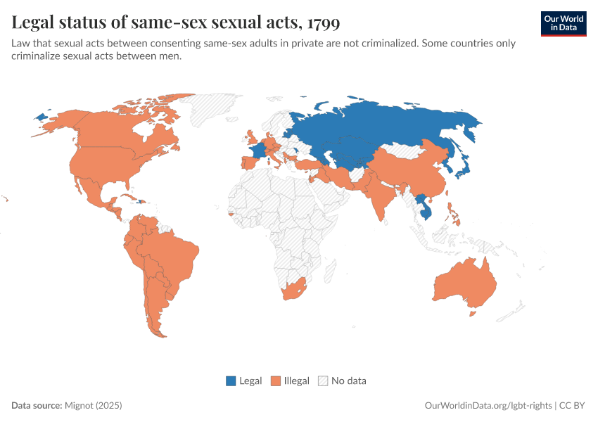 “Data Page: Legal status of same-sex sexual acts”, part of the following publication: Bastian Herre and Pablo Arriagada (2023) - “LGBT+ Rights”. Data adapted from Mignot. Retrieved from https://data-wdi-depsupdate.owid.pages.dev:8789/20250909-093708/grapher/legal-status-of-same-sex-sexual-acts.html [online resource] (archived on September 9, 2025).How to cite this data