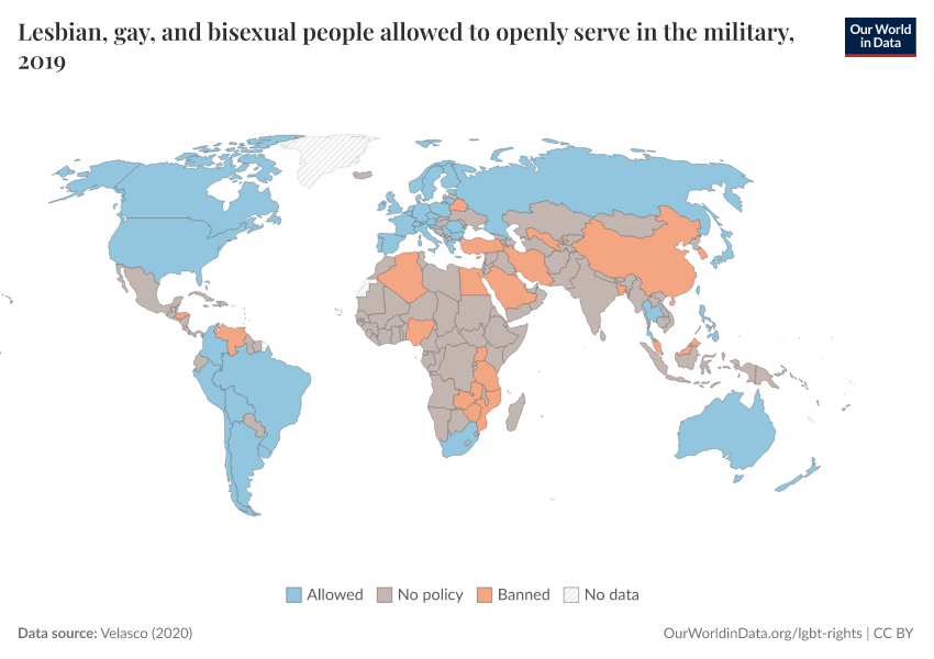 “Data Page: Lesbian, gay, and bisexual people allowed to openly serve in the military”, part of the following publication: Bastian Herre and Pablo Arriagada (2023) - “LGBT+ Rights”. Data adapted from Velasco. Retrieved from https://data-wdi-depsupdate.owid.pages.dev:8789/20251023-195030/grapher/lgb-military-velasco.html [online resource] (archived on October 23, 2025).How to cite this data
