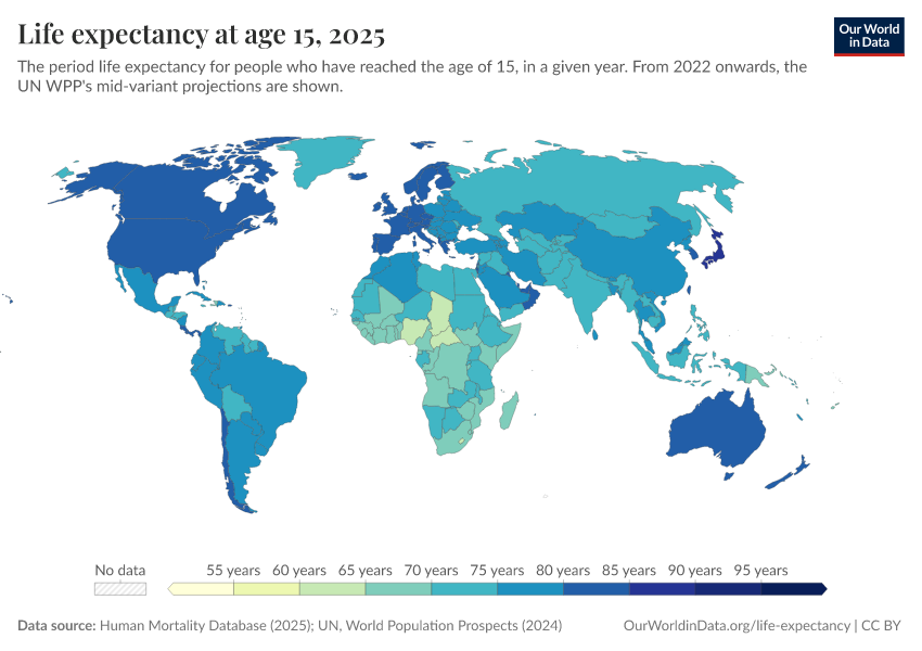 “Data Page: Life expectancy at 15”, part of the following publication: Saloni Dattani, Lucas Rodés-Guirao, Hannah Ritchie, Esteban Ortiz-Ospina, and Max Roser (2023) - “Life Expectancy”. Data adapted from Human Mortality Database, United Nations. Retrieved from https://data-wdi-depsupdate.owid.pages.dev:8789/20260225-014904/grapher/life-expectancy-at-age-15.html [online resource] (archived on February 25, 2026).How to cite this data