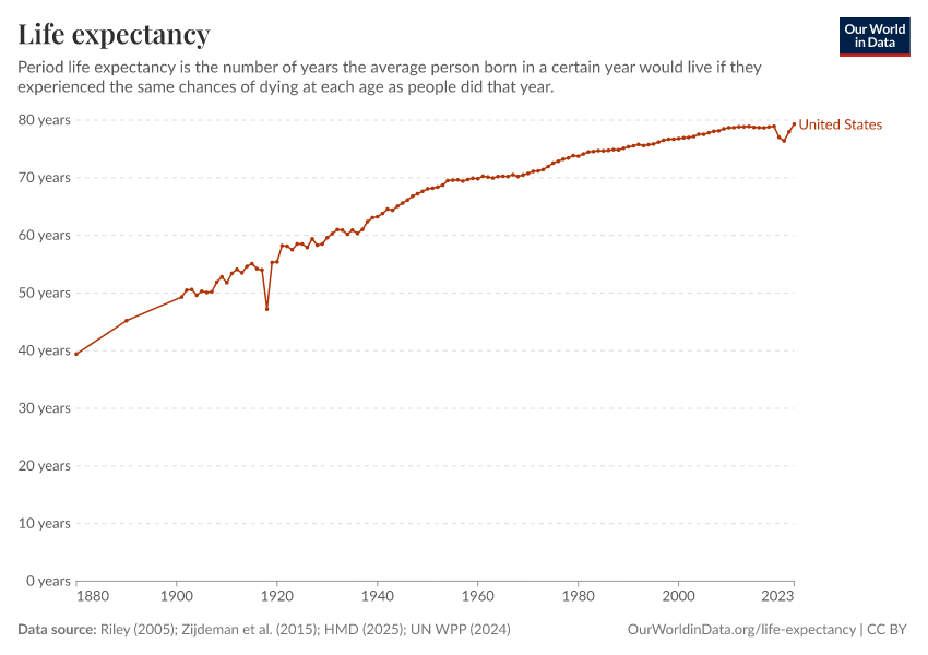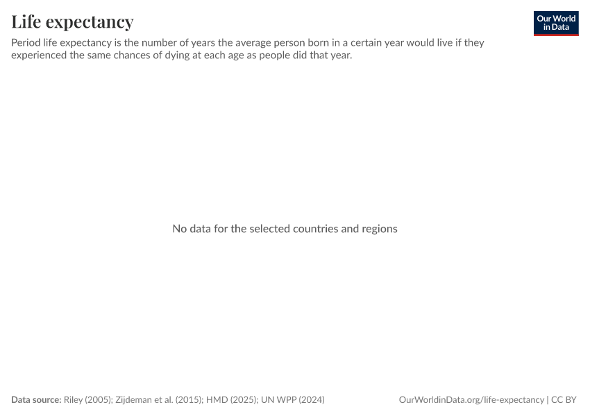 Riley (2005); Zijdeman et al. (2015); HMD (2025); UN WPP (2024) – with major processing by Our World in Data. “Life expectancy – Riley; Zijdeman et al.; HMD; UN WPP – Long-run data” [dataset]. Human Mortality Database, “Human Mortality Database”; United Nations, “World Population Prospects”; Zijdeman et al., “Life Expectancy at birth v2”; James C. Riley, “Estimates of Regional and Global Life Expectancy, 1800-2001” [original data]. Retrieved March 2, 2026 from https://data-wdi-depsupdate.owid.pages.dev:8789/20260225-014904/grapher/life-expectancy.html (archived on February 25, 2026).