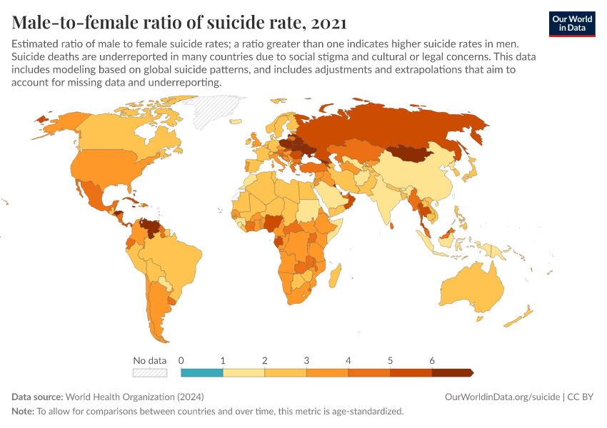 World Health Organization (2024) – with major processing by Our World in Data. “Male-to-female ratio of suicide rate” [dataset]. World Health Organization, “Global Health Estimates” [original data]. Retrieved March 2, 2026 from https://data-wdi-depsupdate.owid.pages.dev:8789/20250909-093708/grapher/male-female-ratio-suicides-rates.html (archived on September 9, 2025).