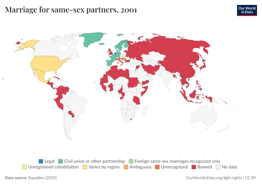 “Data Page: Marriage for same-sex partners”, part of the following publication: Bastian Herre and Pablo Arriagada (2023) - “LGBT+ Rights”. Data adapted from Equaldex. Retrieved from https://data-wdi-depsupdate.owid.pages.dev:8789/20250909-093708/grapher/marriage-same-sex-partners-equaldex.html [online resource] (archived on September 9, 2025).
