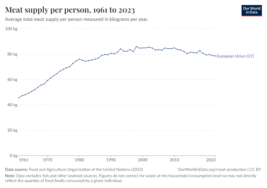 Food and Agriculture Organization of the United Nations (2025) – processed by Our World in Data. “Yearly per capita supply of all meat” [dataset]. Food and Agriculture Organization of the United Nations, “Food Balances: Food Balances (-2013, old methodology and population)”; Food and Agriculture Organization of the United Nations, “Food Balances: Food Balances (2010-)” [original data]. Retrieved March 2, 2026 from https://data-wdi-depsupdate.owid.pages.dev:8789/20260301-071607/grapher/meat-supply-per-person.html (archived on March 1, 2026).