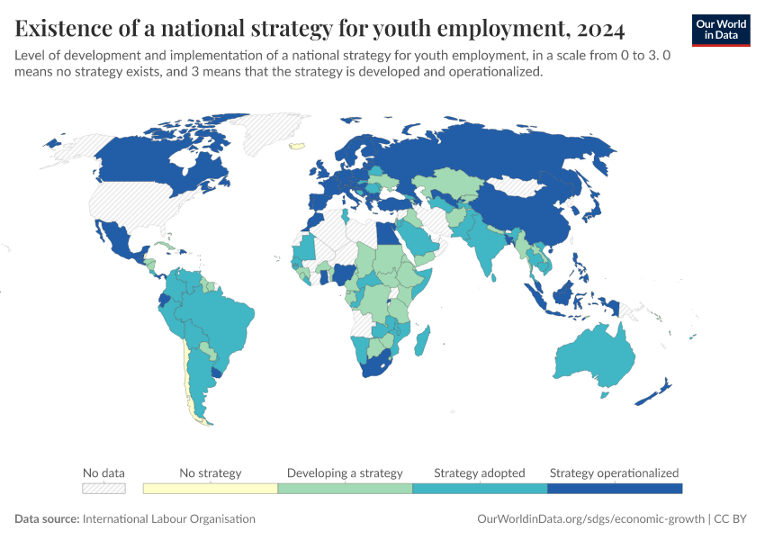 “Data Page: Existence of a national strategy for youth employment”. Our World in Data (2026). Data adapted from International Labour Organisation. Retrieved from https://data-wdi-depsupdate.owid.pages.dev:8789/20251120-211749/grapher/national-strategy-for-youth-employment.html [online resource] (archived on November 20, 2025).How to cite this data