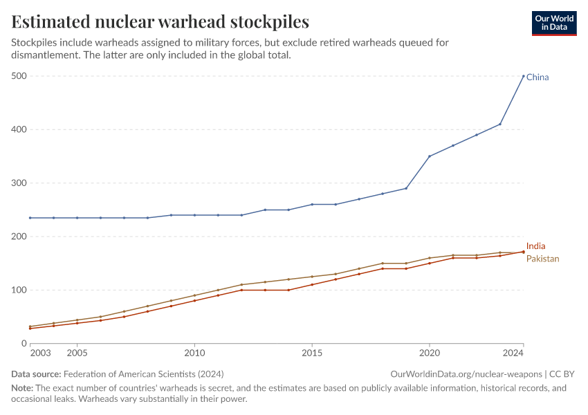 “Data Page: Estimated nuclear warhead stockpiles”, part of the following publication: Bastian Herre, Pablo Rosado, and Max Roser (2024) - “Nuclear Weapons”. Data adapted from Federation of American Scientists. Retrieved from https://data-wdi-depsupdate.owid.pages.dev:8789/20250909-093708/grapher/nuclear-warhead-stockpiles-lines.html [online resource] (archived on September 9, 2025).How to cite this data