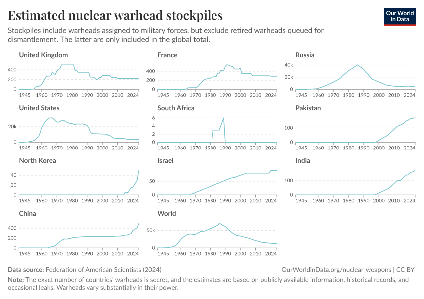Federation of American Scientists (2024) – with minor processing by Our World in Data. “Estimated nuclear warhead stockpiles” [dataset]. Federation of American Scientists, “Estimated Global Nuclear Warhead Inventories” [original data]. Retrieved March 2, 2026 from https://data-wdi-depsupdate.owid.pages.dev:8789/20250909-093708/grapher/nuclear-warhead-stockpiles-lines.html (archived on September 9, 2025).