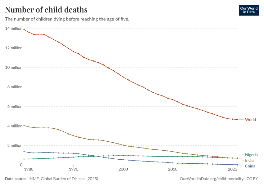 IHME, Global Burden of Disease (2025) – with major processing by Our World in Data. “Number of child deaths” [dataset]. IHME, Global Burden of Disease, “Global Burden of Disease - Deaths” [original data]. Retrieved March 2, 2026 from https://data-wdi-depsupdate.owid.pages.dev:8789/20260211-174736/grapher/number-of-child-deaths.html (archived on February 11, 2026).