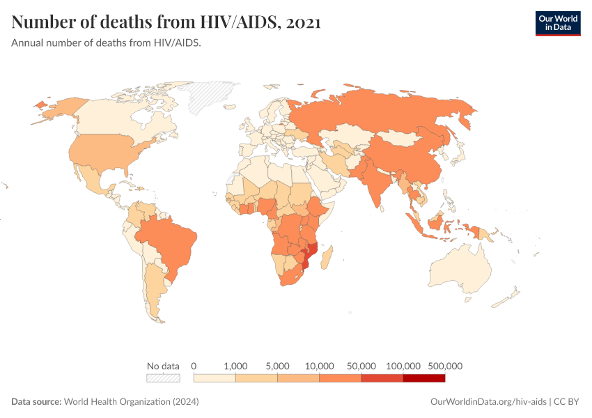 World Health Organization (2024) – with major processing by Our World in Data. “Number of deaths from HIV/AIDS” [dataset]. World Health Organization, “Global Health Estimates” [original data]. Retrieved March 2, 2026 from https://data-wdi-depsupdate.owid.pages.dev:8789/20250909-093708/grapher/number-of-deaths-from-hivaids-who.html (archived on September 9, 2025).