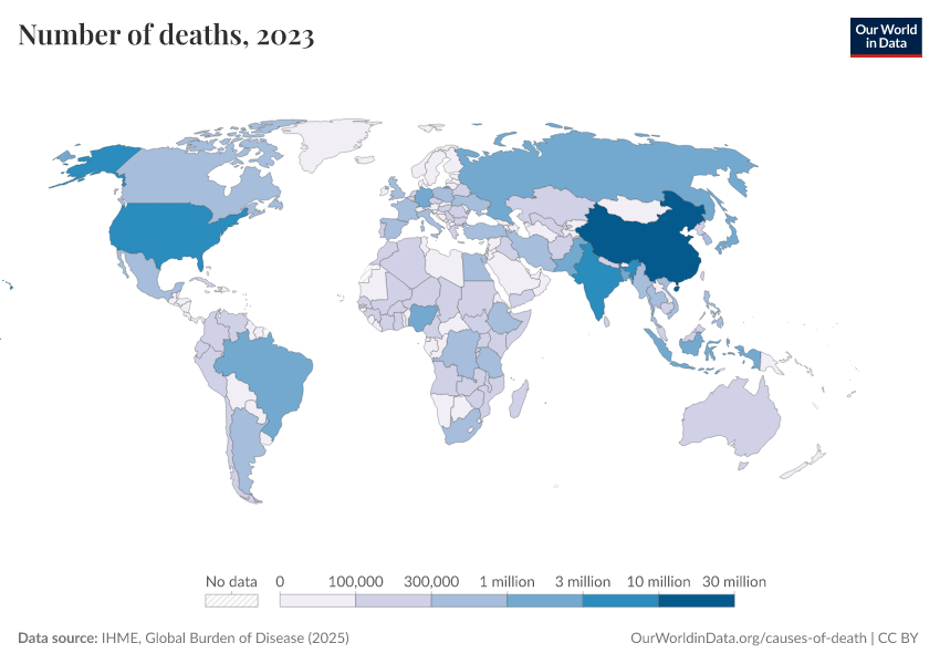 IHME, Global Burden of Disease (2025) – with major processing by Our World in Data. “Number of deaths” [dataset]. IHME, Global Burden of Disease, “Global Burden of Disease - Deaths” [original data]. Retrieved March 2, 2026 from https://data-wdi-depsupdate.owid.pages.dev:8789/20260211-174736/grapher/number-of-deaths-gbd.html (archived on February 11, 2026).