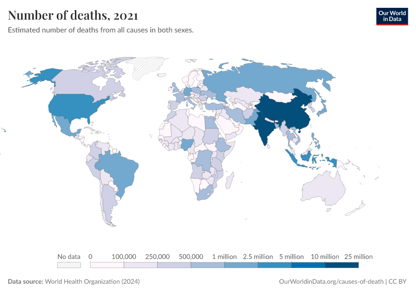“Data Page: Number of deaths”, part of the following publication: Esteban Ortiz-Ospina and Max Roser (2016) - “Global Health”. Data adapted from World Health Organization. Retrieved from https://data-wdi-depsupdate.owid.pages.dev:8789/20250909-093708/grapher/number-of-deaths-who.html [online resource] (archived on September 9, 2025).How to cite this data