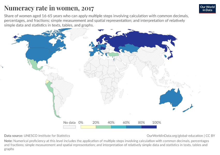 “Data Page: Numeracy rate in women”. Our World in Data (2026). Data adapted from UNESCO Institute for Statistics. Retrieved from https://data-wdi-depsupdate.owid.pages.dev:8789/20260105-133053/grapher/numeracy-rate-in-adult-women-sdg.html [online resource] (archived on January 5, 2026).How to cite this data