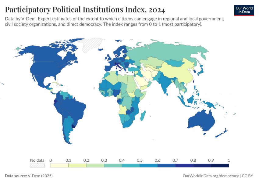 “Data Page: Participatory political institutions”, part of the following publication: Bastian Herre, Lucas Rodés-Guirao, and Esteban Ortiz-Ospina (2013) - “Democracy”. Data adapted from V-Dem. Retrieved from https://data-wdi-depsupdate.owid.pages.dev:8789/20260119-070102/grapher/participatory-political-institutions-index.html [online resource] (archived on January 19, 2026).How to cite this data