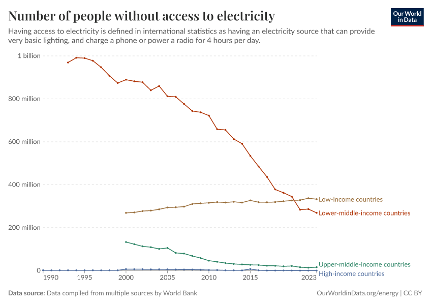 Data compiled from multiple sources by World Bank – with major processing by Our World in Data. “Number of people without access to electricity – World Bank” [dataset]. SDG 7.1.1 Electrification Dataset, World Bank, via World Bank, “World Development Indicators 125”; United Nations Population Division, national statistical offices, and Eurostat, via World Bank, “World Development Indicators 125” [original data]. Retrieved March 2, 2026 from https://data-wdi-depsupdate.owid.pages.dev:8789/20260301-083443/grapher/people-without-electricity-country.html (archived on March 1, 2026).